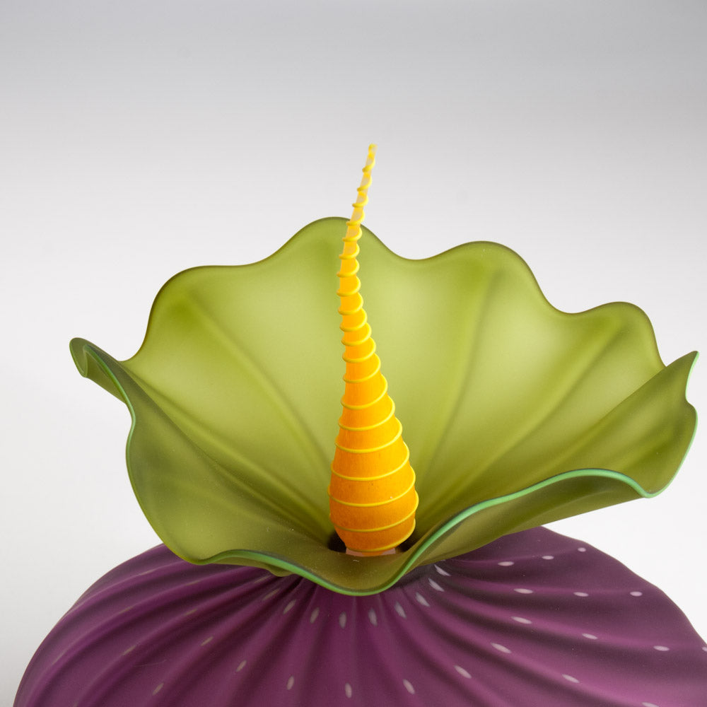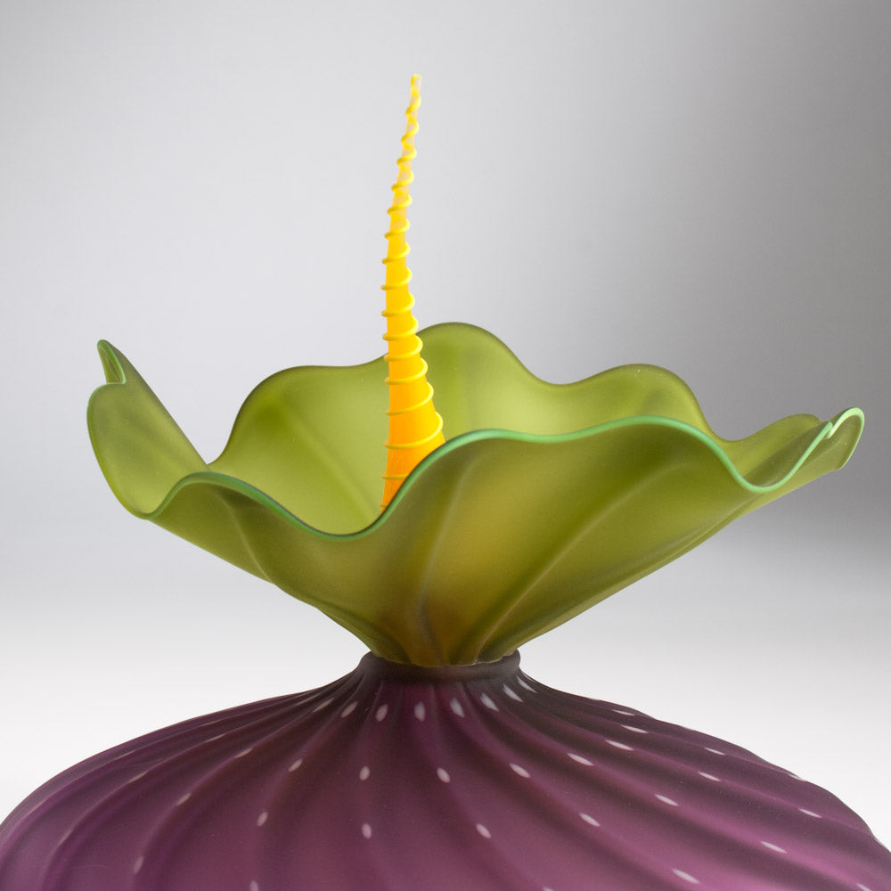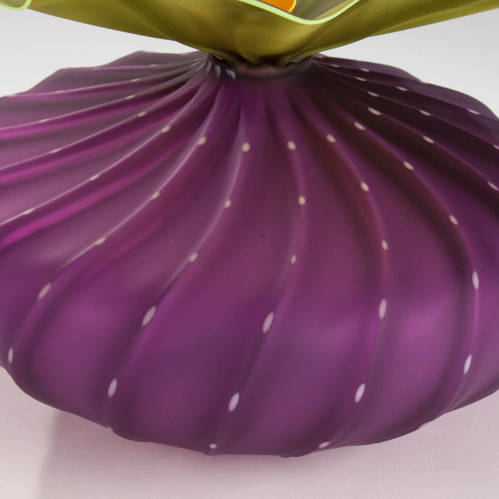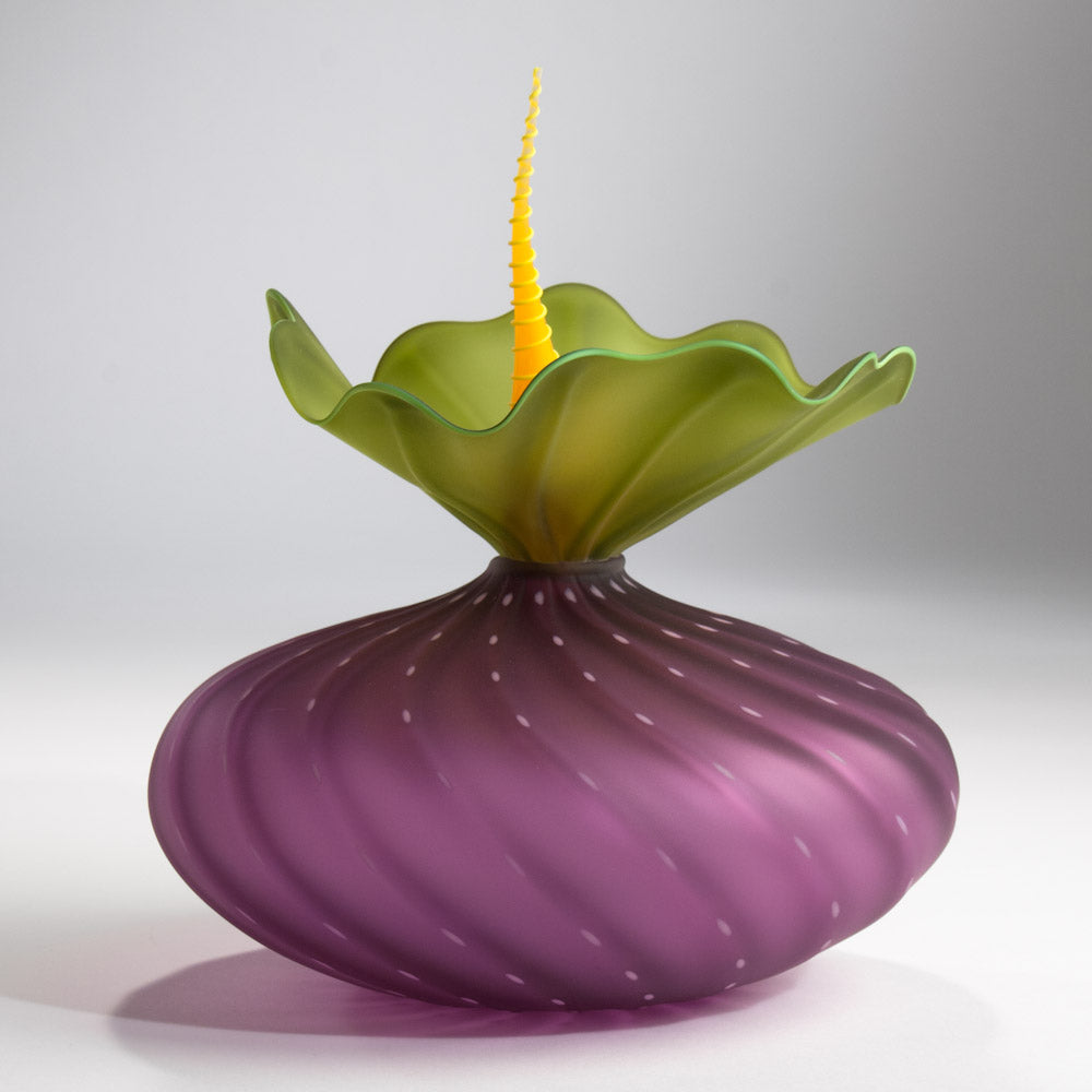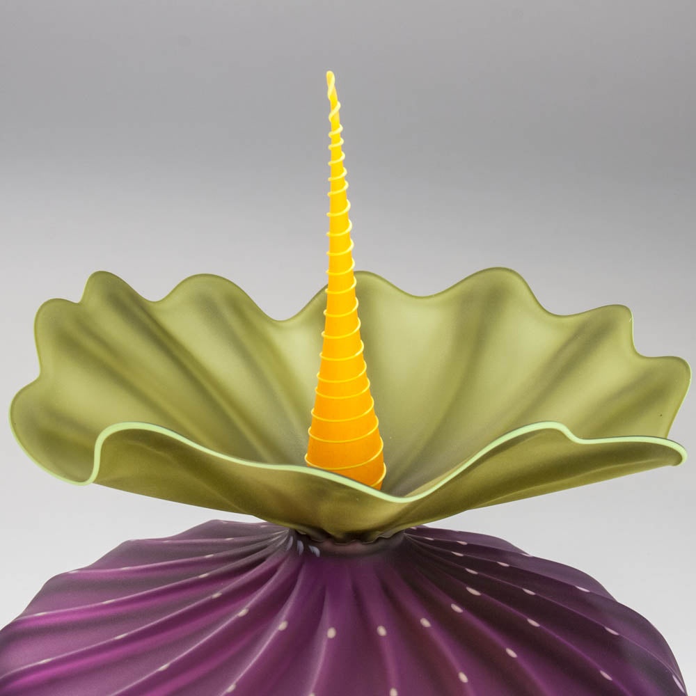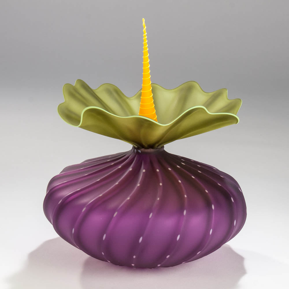 This hyacinth BobTanical vessel has hyacinth sea urchin shaped body with light pink dots. Olive ruffle with olive rim. Stopper is mango with mango spiral. Mouth blown and frosted.