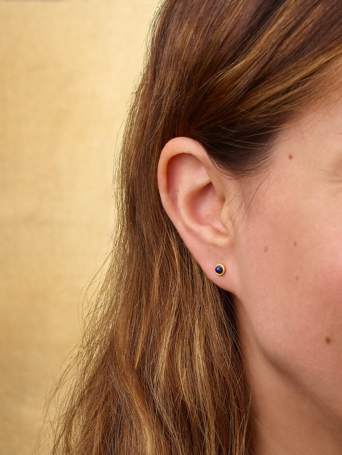Regular price $150.00 Save $-150.00These minimalist yet striking earrings by Bernd Wolf are crafted with timeless elegance in mind. Each stud features a deep blue lapis lazuli stone, its rich hue beautifully framed in 24-karat gold plating, evoking a sense of both luxury and calm.